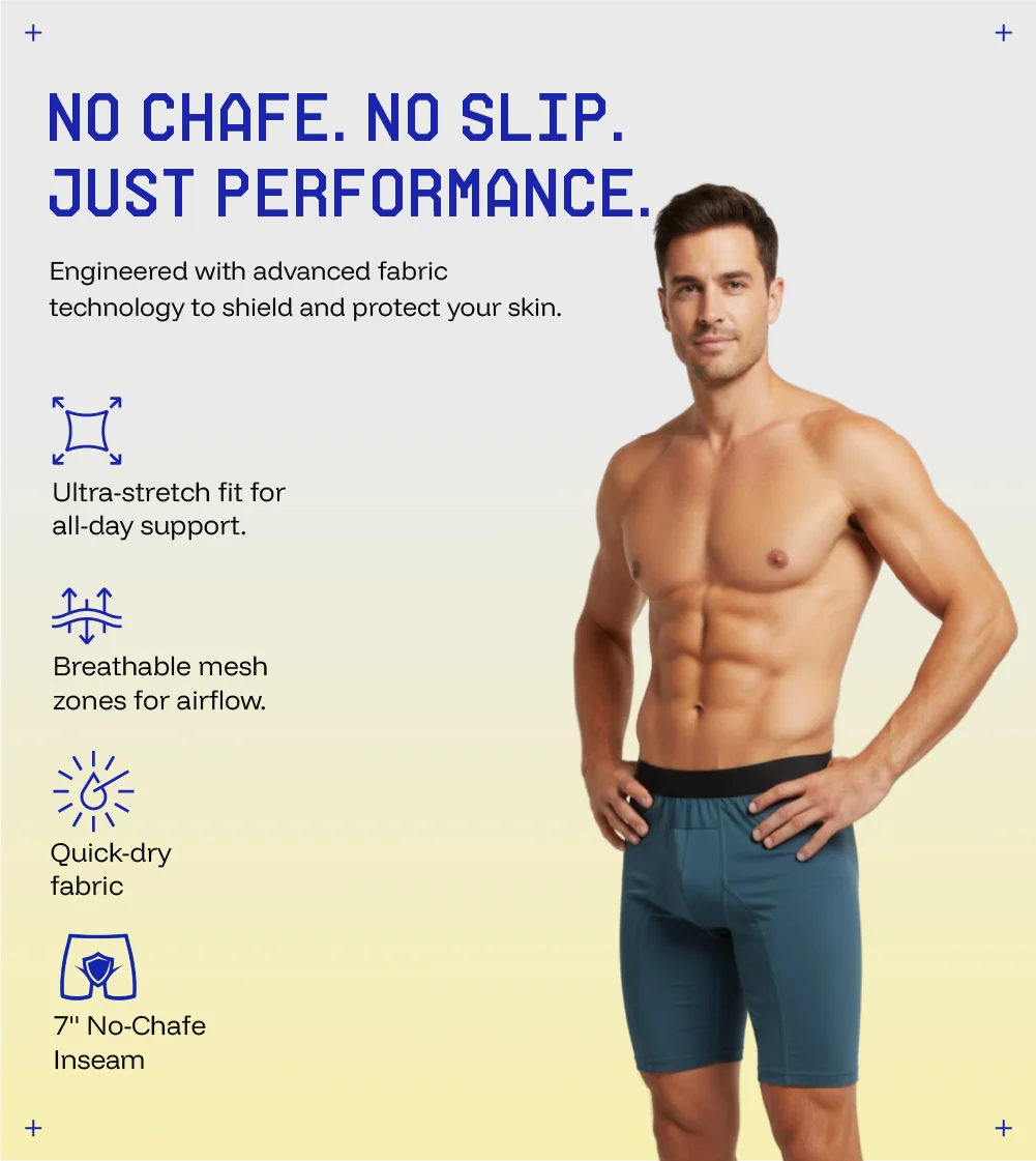Meet the Anti-Chafing Undies built for movement, miles, and everyday grind. Designed with targeted compression to support muscles, prevent thigh rub, and keep you fresh for longer, these aren’t your regular innerwear — they’re performance gear. The 7" inseam eliminates chafing, the non-slip grip keeps it in place, and the breathable quick-dry fabric keeps you cool from warm-ups to long days outside. Made with an ultra-smooth 88% Polyamide and 12% Spandex blend, it’s engineered for comfort, durability, and all-day performance.